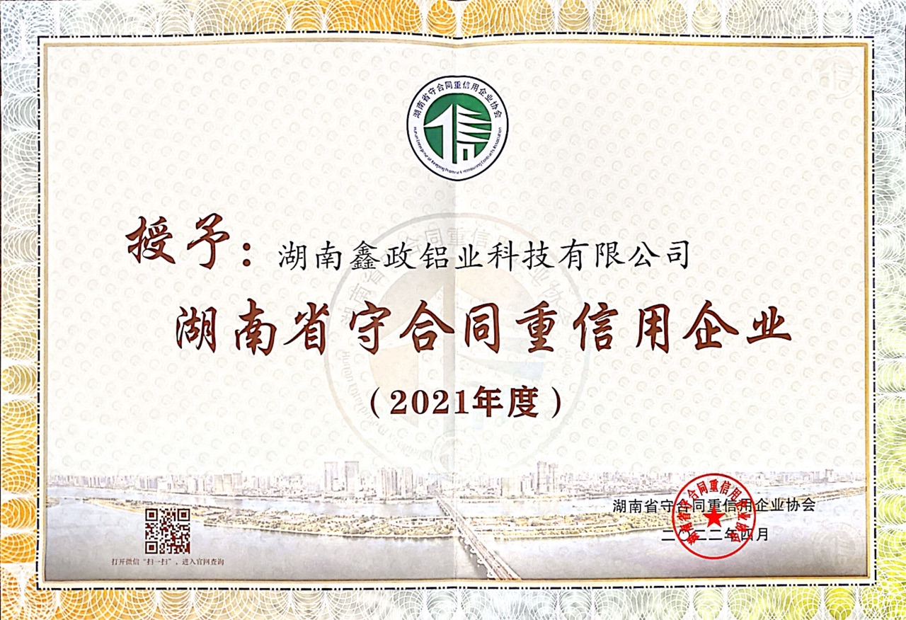瀏覽次數(shù):1307近日,2021年度湖南省“守合同重信用企業(yè)”名單公布,湖南鑫政鋁業(yè)科技有限公司榮膺湖南省“守合同重信用企業(yè)”稱號。
