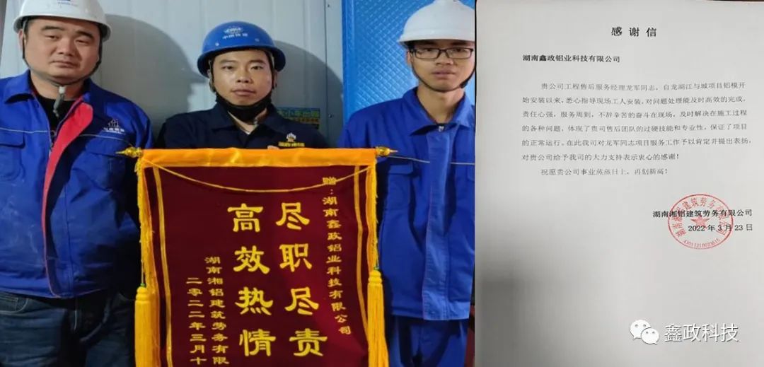 榮譽源自信任,信任源自擔當。錦旗既是對鑫政集團的鼓勵也是一種鞭策,集團未來將繼續以優質服務貫穿始終,以客戶需求為導向,以客戶滿意為目標,進一步完善現場技術服務體系,提升技術服務人員專業能力,切實保障項目進度高效執行,讓客戶樂享“鑫”服務,為客戶創造“鑫”價值,與客戶共創“鑫”輝煌。