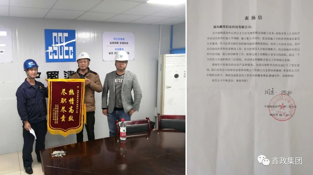 瀏覽次數:1570近日,中建五局第三建設有限公司中建梅溪湖中心項目部和現場勞務公司長沙博大建筑勞務有限公司送來錦旗和表揚信,對鑫政鋁業技術服務科楊共忠在項目上的出色表現給予了充分肯定和高度評價。_20250530091630A310.jpg)