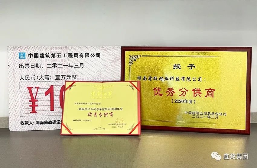 瀏覽次數(shù):1510喜訊連連捷報(bào)傳。近日,在中建五局總承包公司2021年分包(供)商答謝會(huì)暨優(yōu)秀分包(供)商表彰會(huì)上,集團(tuán)下屬子公司湖南鑫政鋁業(yè)科技有限公司與湖南鑫政建設(shè)有限公司分別喜獲2020年度“優(yōu)秀分供商”與“良好分包商”獎(jiǎng)項(xiàng)。